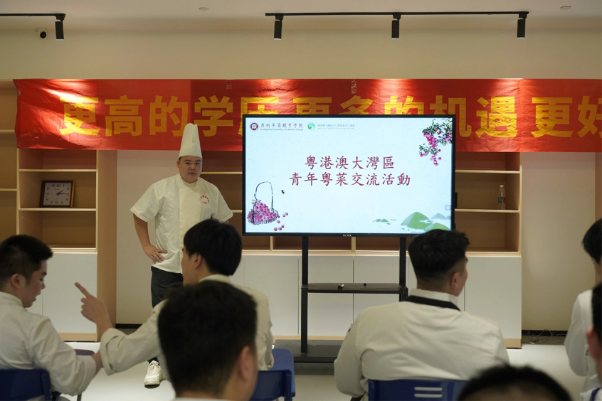 烹饪专业组教研组长杨龙星老师为学员代表讲解“增城荔枝文化及特色荔枝菜肴——荔枝芝士虾球”相关内容,其中包括增城荔枝文化、菜式来源、烹饪方法、创新经验,让穗港两地青年对增城荔枝文化和荔枝芝士虾球的制作过程有更深入的了解。