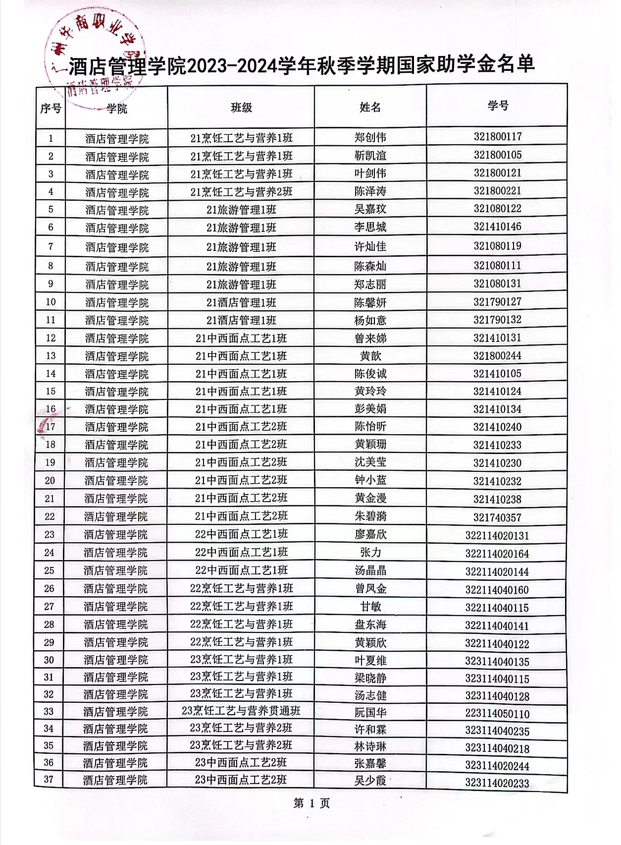 按照《广东省教育厅关于做好2023年秋季学期学生资助工作的通知》文件精神,经学校资助工作安排,依照国家助学金评定办法,经过学生申请、学院评审工作小组审核等程序,我院共63人参与贫困认定,其中被认定为不困难26人,一般困难16人,困难3人,特别困难18人。经学院评审工作小组研究决定,推荐郑创伟等37位同学作为酒店管理学院2023年秋季学期国家助学金获得者。现将名单公示如下: