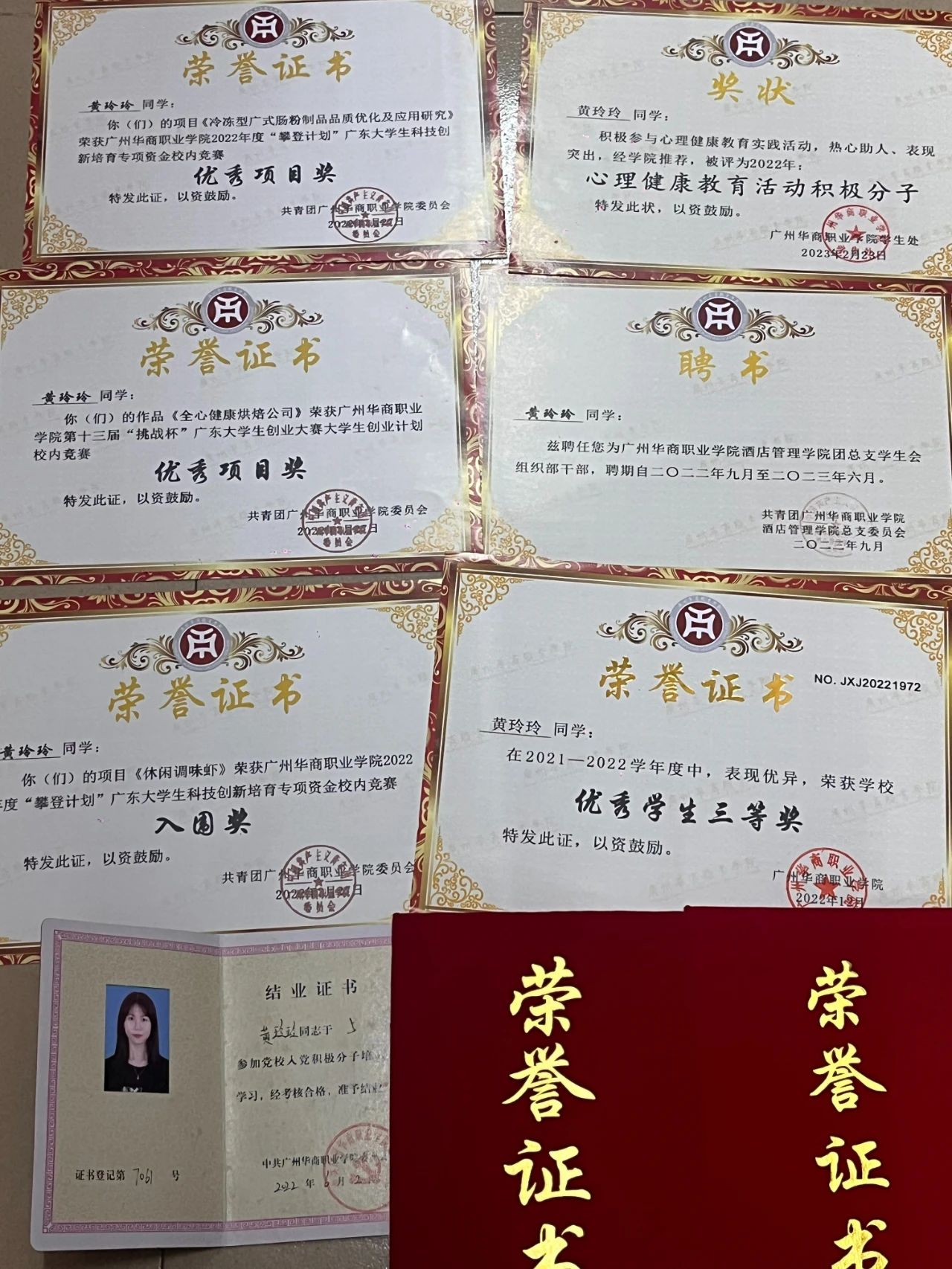 在学习上,黄玲玲同学学习态度严肃认真,不逃课,不迟到早退,认真做好课前预习和课后笔记整理工作,学习目的明确,态度端正,勤奋刻苦,锐意进取,对大学课程充满了浓厚的兴趣,并且善于总结学习经验,不断改进学习方法,理论联系实际,通过不懈努力,在校期间,荣获国家励志奖学金、校二等、三等奖。考取了1+x粤点中级证书、普通话二乙、信息化办公、多媒体设计与制作师,为了充实提高自己,我从不放松自己的业余学习。