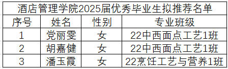 通过学生自主提交申请,我院评审小组根据学生提交的材料,严格按照学校下发的评选条件进行筛选以及资料审核,坚持公平、公正、公开的原则,从学生在校表现、个人思想政治素质、学习成绩、所获得各类奖项、对学校、学院贡献等方面综合考察,最终拟推荐党丽雯等3名同学作为酒店管理学院2025届优秀毕业生,具体名单如下: