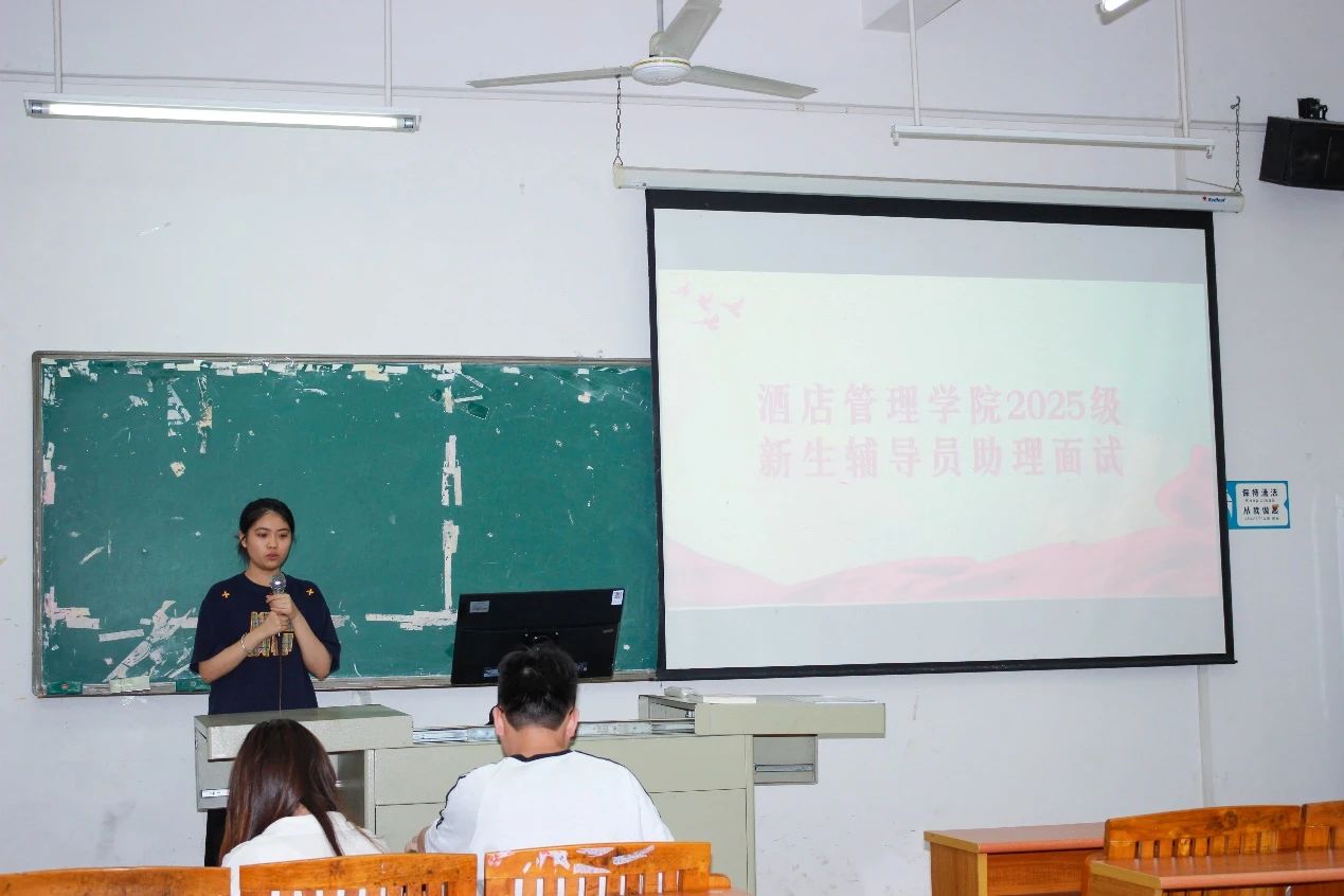 2025年6月4日,SUNBET申搏官网酒店管理学院25级辅导员助理首轮面试在博B202教室顺利举行并圆满收官。此次面试旨在选拔出责任心强、综合素质高的学生担任25级新生辅导员助理,协助辅导员开展新生管理与服务工作,为学院学生工作注入新活力。酒店管理学院辅导员黄向荣、陈海宁老师担任此次面试的面试官。
