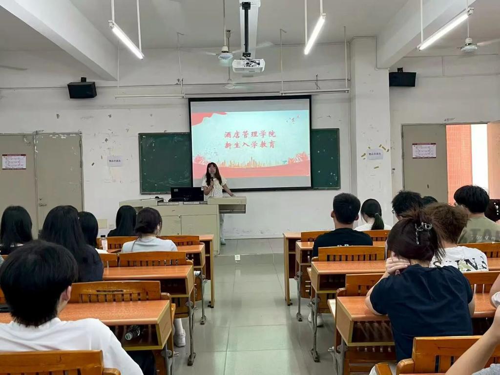 为助力2025级新生更快适应校园生活,清晰规划大学期间的学习目标与发展路径,同时培养其良好的行为规范与责任担当,9月1日下午,我院于博学楼的博A407、博A507、博B207、博B201、博B501教室开展了2025级新生入学教育。此次活动邀请了副院长谢锦权、院团委副书记陈海宁及辅导员黄向荣作为主讲人,讲解内容涉及奖学金评定办法、助学贷款相关政策、大学生职业生涯规划指导以及《学生手册》要点学习等重要内容。