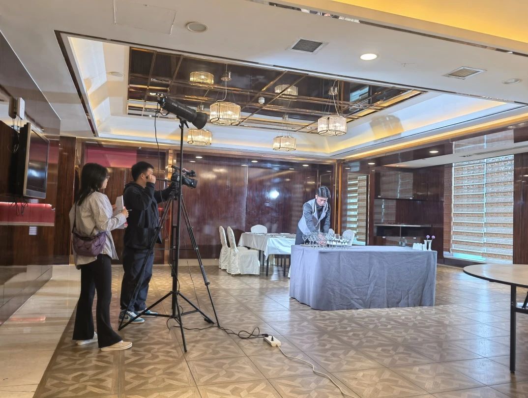 此次实训视频拍摄不仅是对课堂教学的有效延伸,更是对酒店行业实践需求与教育教学深度融合的积极探索。通过专业的拍摄与后期制作,这些实训视频将成为酒店管理学院重要的教学资料,助力更多学生直观学习宴会设计与摆台技巧,为培养适应行业需求的高素质酒店管理人才奠定坚实基础。