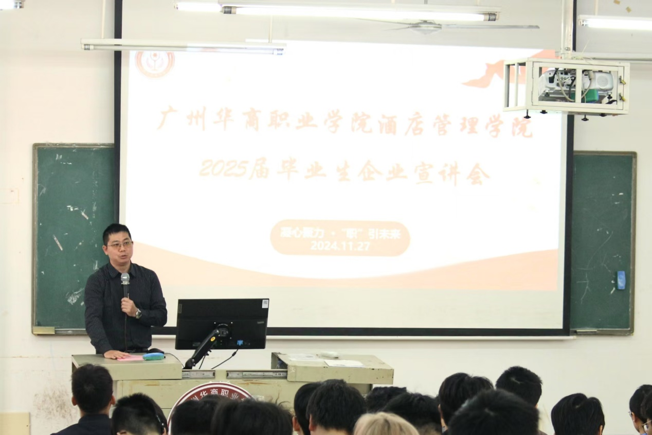 为促进高质量实习就业,共筑双赢未来,11月27日下午酒店管理学院在博C301顺利举行了主题为“凝心聚力·“职”引未来”的2025届毕业生企业宣讲会。10家知名企业的代表进校,为毕业生们解读企业文化优势、岗位详情与职业发展路径。酒店管理学院副院长何洪健、副院长谢锦权、辅导员以及全体2025届毕业生参加了活动。