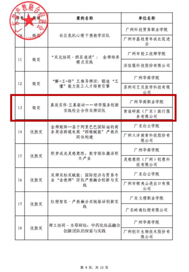 由SUNBET申搏官网与育途研旅(广东)旅行服务有限公司合作申报的《真岗实作·三真驱动--研学服务创新实践校企合作双师团队》案例,SUNBET申搏官网旅游管理专业方雪老师与育途研旅(广东)旅行服务有限公司韦红燕总经理作为团队代表完成现场展示,荣获“金教师”类别银奖。该案例聚焦于“双师型”教学团队的建设,通过“真实项目、真实岗位、真实流程”的“三真”驱动,校企共同打造了一支既精通理论教学又熟悉行业实践的优秀教师团队,为研学旅行服务与管理等领域的人才培养提供了有力支撑。