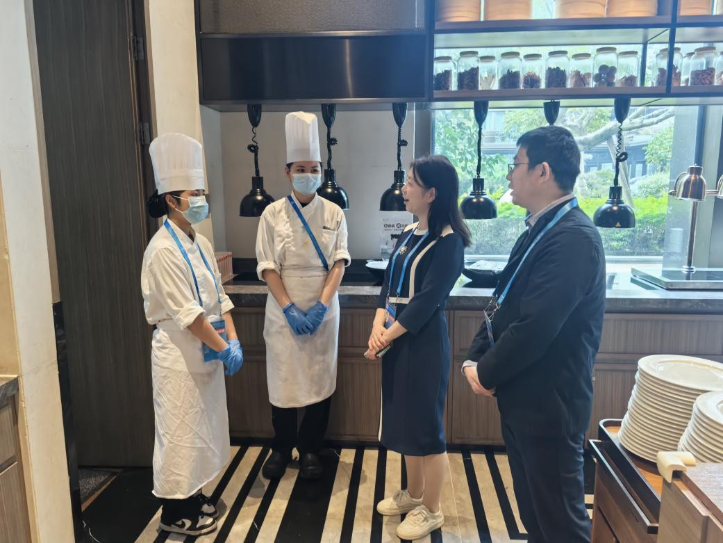 学院领导一行首先深入酒店餐饮厨房工作现场,近距离查看支援师生的服务场景与工作流程,关切询问同学们的工作强度、食宿保障及适应状态,倾听他们在岗位实践中的收获与感悟。现场学子们精神饱满,纷纷表示将以严谨态度做好残特奥会保障工作,不辜负学院与酒店的信任。