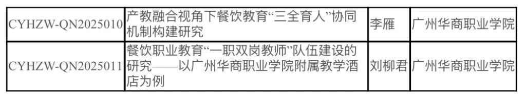 我院此次立项的课题聚焦餐饮职业教育的前沿问题,涵盖产教融合协同育人、师资队伍建设、人才培养模式创新、美育教育实践等多个方向,为行业高质量发展提供了理论支撑和实践路径。具体立项情况如下: