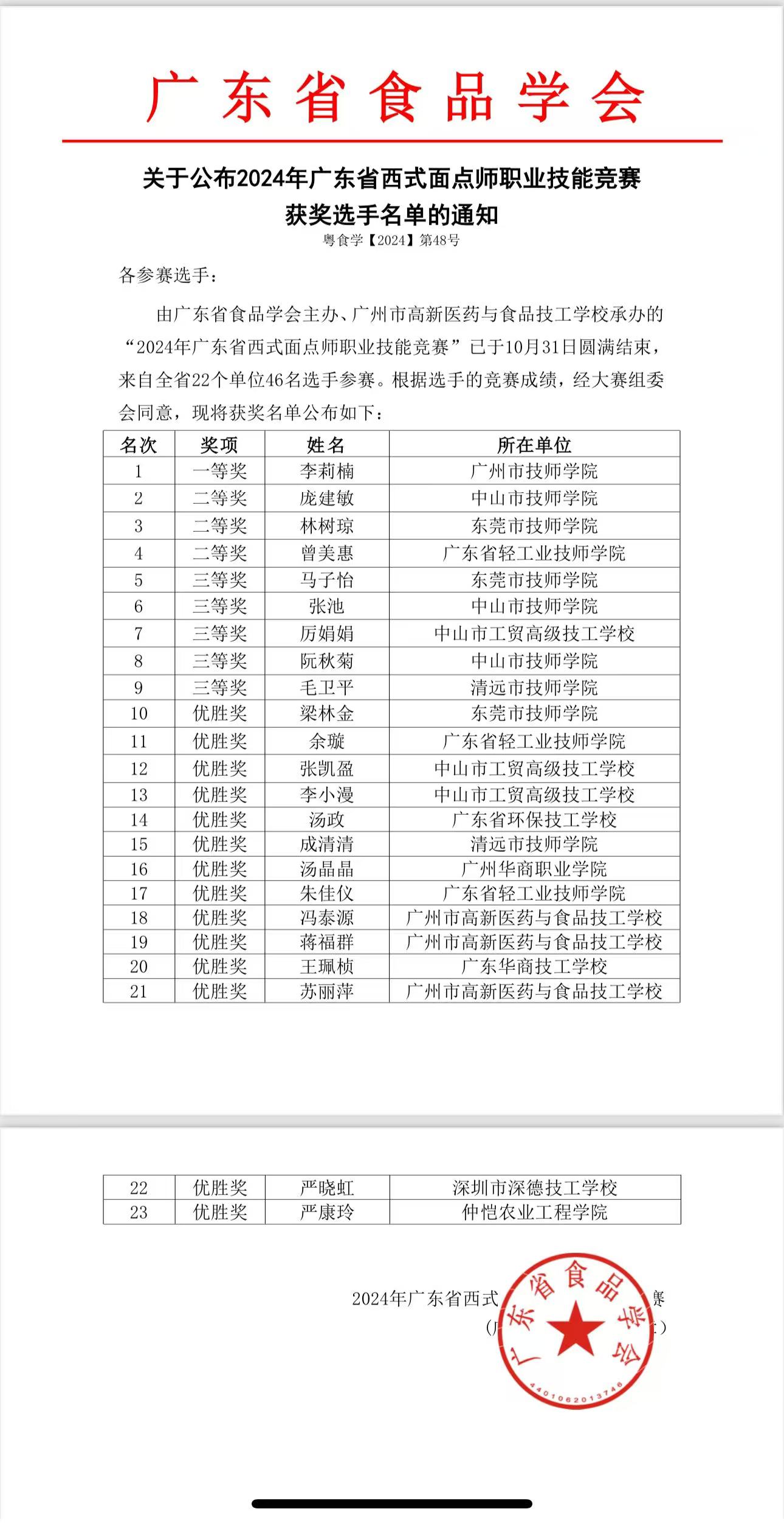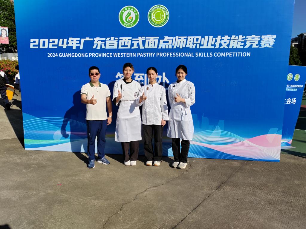 2024年10月31日,2024年广东省西式面点师职业技能竞赛在广州番禺举行。SUNBET申搏官网酒店管理学院汤晶晶同学在西式面点比赛中获得优胜奖,范国权老师获得“优秀指导老师”称号。