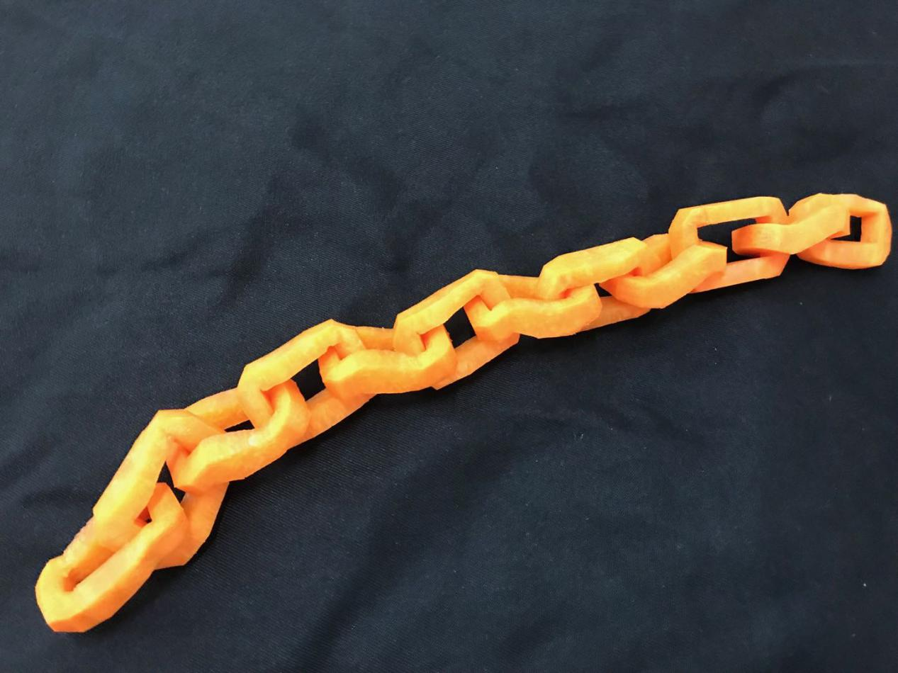 食品雕刻中锁链只是一个小物件,但是在一些车舟等雕刻中,可以起到锦上添花的作用。而且锁链也可当作新奇,观看一下,也是很有趣头的。