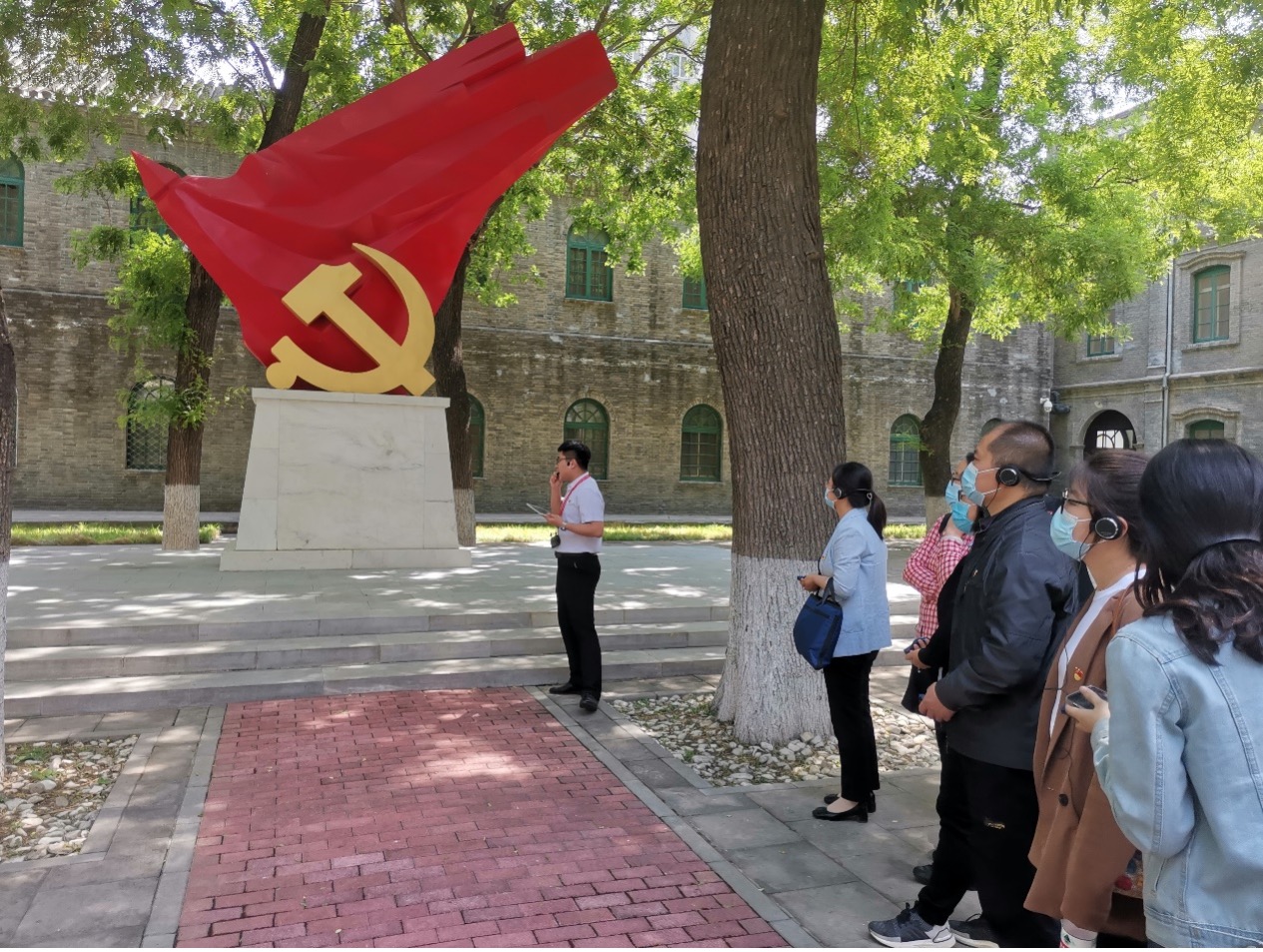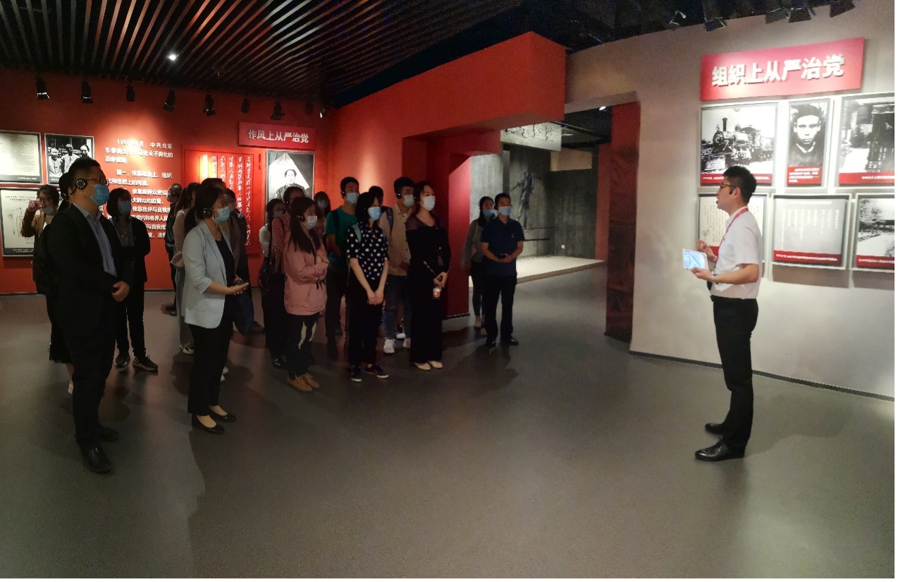 在讲解员的带领下,一行人步入基地院子,被“金色的镰刀斧头,庄严的党旗”雕塑深深吸引,其基座高1921、总高4.9米,象征着中国共产党成立和中华人民共和国成立,一副充满历史厚重感的全面从严治党发展史随之徐徐展开:1848年马克思、恩格斯在比利时布鲁塞尔白天鹅旅馆咖啡厅共同起草《共产党宣言》;李大钊同志就人生、理想和党性和同志们进行“跨时空对话”;草岚子监狱的共产党员通过洋瓷缸子和暖气相互鼓励通信,建立了党组织;江姐带领狱中的同志们绣红旗;焦裕禄同志奋战在兰考县治沙、治水、治碱的第一线;白衣战士丁秀兰在“非典”肆虐横行时因公殉职等,前辈们崇高的理想信念、高尚的道德情操、廉洁务实的工作作风深深震撼着在场的每一位同志。