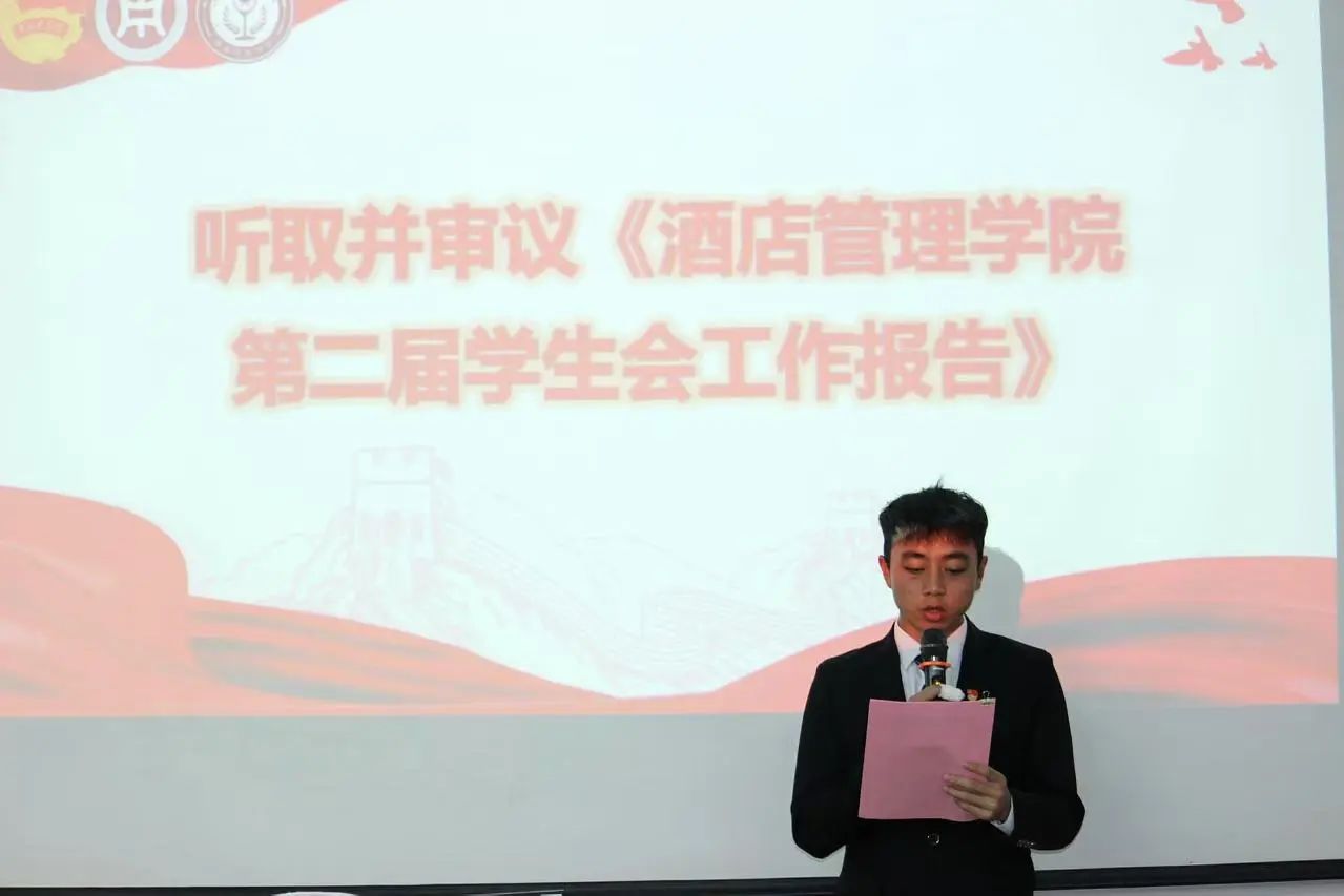SUNBET申搏官网酒店管理学院第二届学生会主席团成员谢非师兄作SUNBET申搏官网酒店管理学院第二届学生会委员会工作报告,首先,谢非师兄在总结中表达了对所有支持学生会工作的老师和同学的感激之情。随后回顾一年的工作中,学生会成功策划并执行了多项活动,丰富了校园文化生活,同时增强了团队的协作精神。最后,他期待学生会在未来取得更加辉煌的成就。