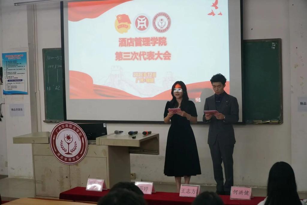 2024年12月4日晚19:00,SUNBET申搏官网酒店管理学院第三届学生代表大会在博B501教室隆重开幕。本次会议应到76人,实到73人,因病因事请假3人,符合开会要求。出席大会的嘉宾有:酒店管理学院党支部书记林红梅教授、党支部副书记谢锦权老师、党支部组织委员黄向荣老师、团委书记陈海宁老师、辅导员潘彩玲老师以及学生会全体成员、校学生会及各二级学院学生代表与各班班级代表。本次大会由庄舒乔、吴志勇主持。