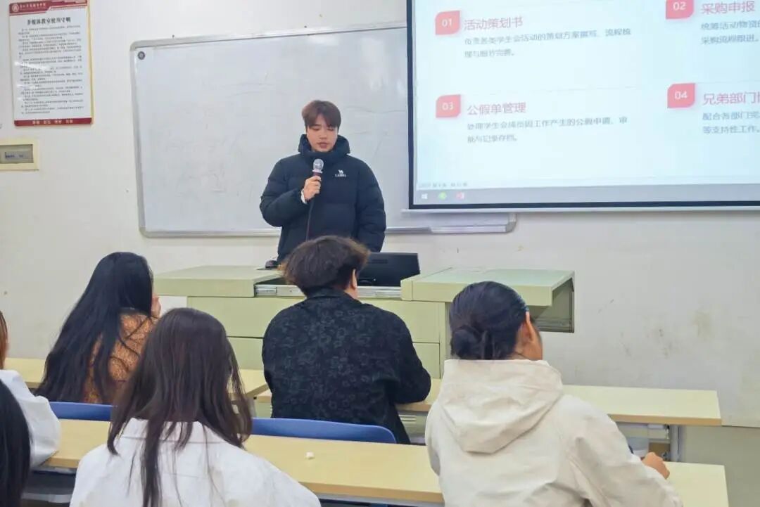 会上,主席团与各部门负责人轮流进行述职汇报,围绕学年工作内容、取得成果、现存问题及未来改进方向作了详细阐述。述职过程中,各成员通过数据、案例与活动照片生动呈现了工作亮点,也坦诚剖析了当前存在的不足。