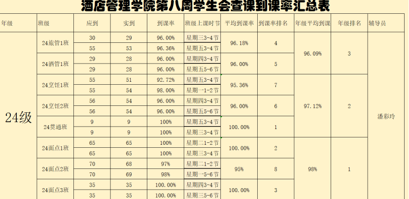书山有路勤为径,学海无涯苦作舟。以下是酒店管理学院学生会纪检部对我院第八周的学生到课情况汇总结果: