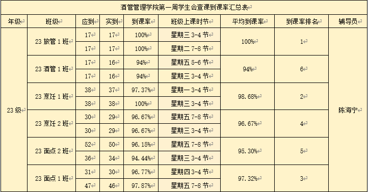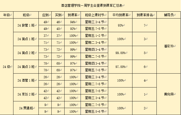 书山有路勤为径,学海无涯苦作舟。以下是酒店管理学院学生会纪检部对我院第一周的学生到课情况汇总结果: