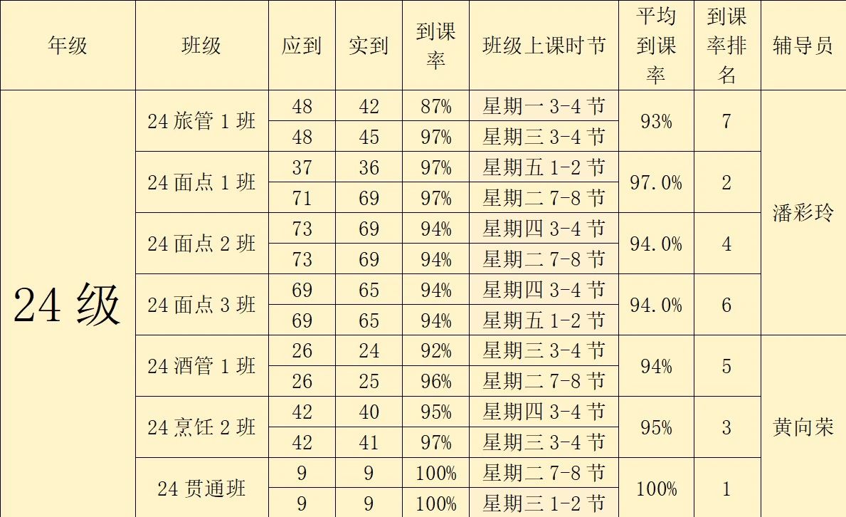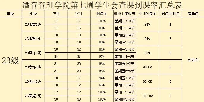 书山有路勤为径,学海无涯苦作舟。以下是酒店管理学院学生会纪检部对我院第七周的学生到课情况汇总结果: