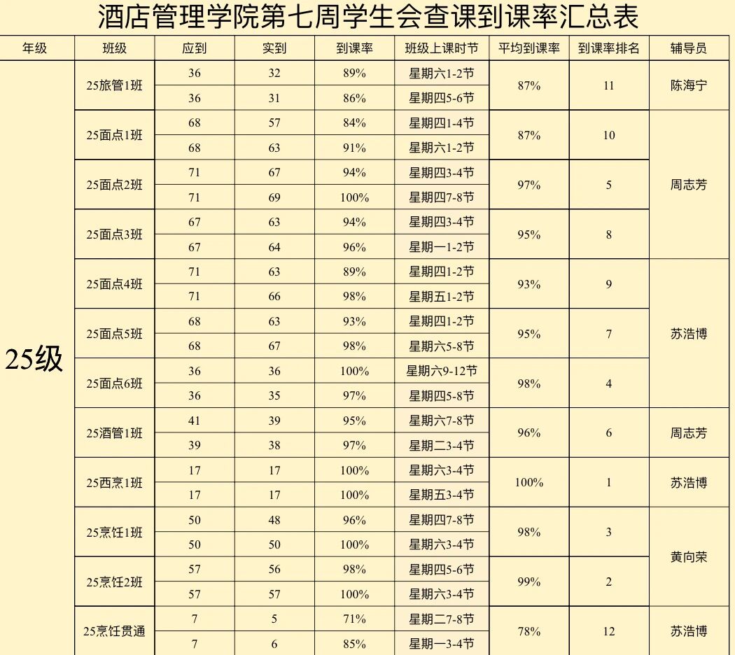 以下是酒店管理学院第七周到课率: