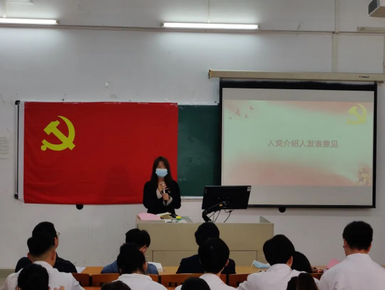 随后,入党介绍人陈海宁老师就七名预备党员在校期间以及实习期间的表现进行了介绍,陈海宁老师表示:这七名预备党员同学始终在思想上和政治上和党中央保持高度一致,乐观向上,与人为善,能吃苦、肯奋斗,体现出了踏实肯干的品质发挥了良好的先锋模范作用,符合成为正式党员的基本要求,同意以上七位预备党员发展为正式党员。