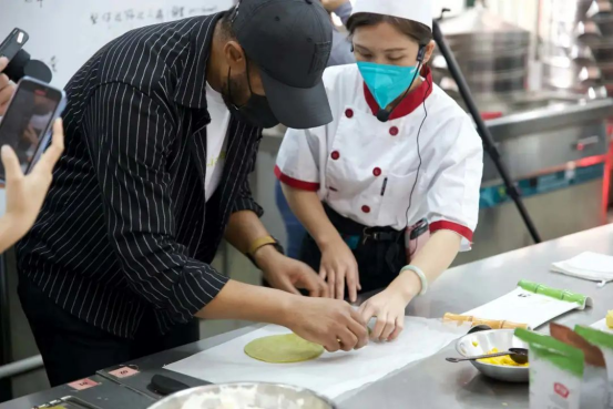 随后,外国留学生们来到我院面点制作实训室参观。在面点专业老师的的讲解示范下,我院学生与外国留学生们一起制作特色面点美食——毛巾卷、红豆酥等,中外大学生在共同制作广式点心的过程中不仅促进了交流、也快速架起了友谊的桥梁。