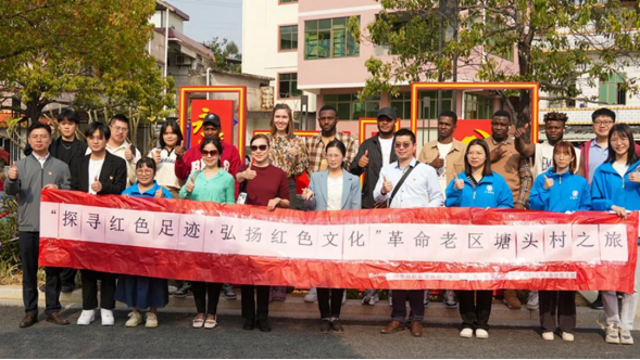 第二站,队伍参观了革命老区石滩镇塘头村。习近平总书记在党的二十大报告中提出了“推进文化自信自强,铸就社会主义文化新辉煌”的重大任务,就“繁荣发展文化事业和文化产业”作出部署安排,为做好新时代工作提供了根本遵循、指明了前进方向。打卡石滩镇塘头村这个红色文化特色村,既是学习践行二十大精神的生动体验,同时也是向外国留学生展示我们中华民族特有的红色文化。