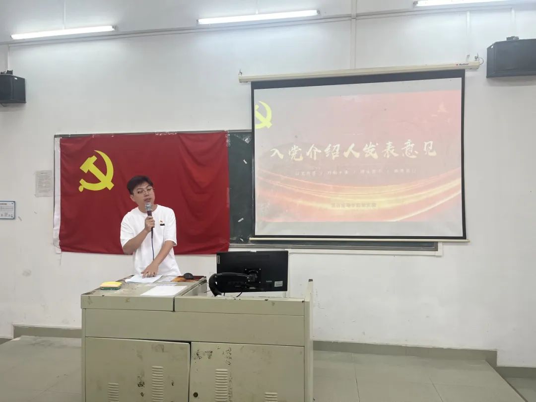 随后,入党介绍人黄向荣老师与陈海宁老师介绍了4名预备党员在校期间以及实习期间的表现,两名老师表示:这4名预备党员同学始终在思想上和政治上与党保持高度统一,他们为人乐观积极,与人为善,肯吃苦能吃苦,时刻牢记成为一名合格党员的标准,不忘初心,不忘使命,发挥了良好的先锋模范作用,符合成为正式党员的基本标准,同意以上4名预备党员按期转为正式党员。