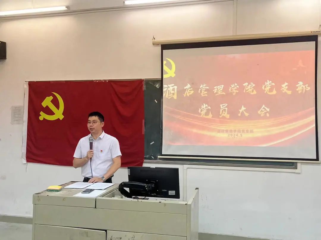为了不断加强党员队伍建设、确保党员质量、增强党组织的凝聚力和战斗力,2024年5月31日中午,酒店管理学院直属党支部在创教206教室召开了党员大会。我院全体师生党员(含预备党员)以及50多名入党积极分子参加了大会,党支部书记谢锦权主持了党员大会。