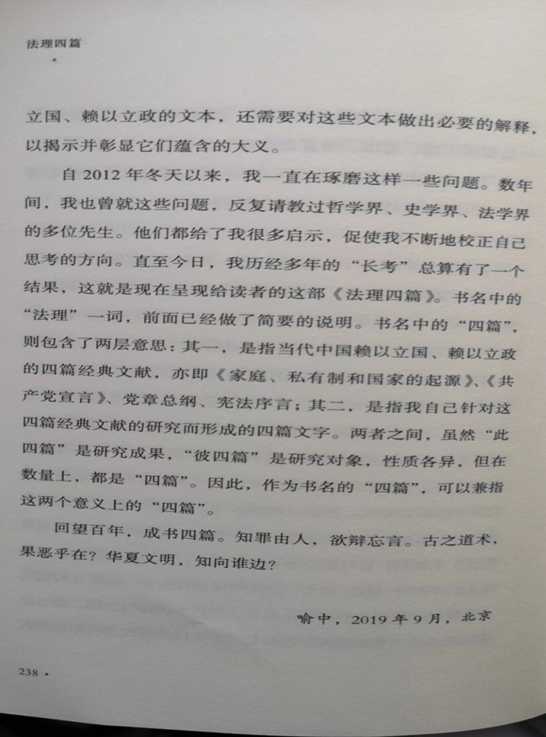 朱子的《四书章句集注》是关于《大学》《中庸》《论语》《孟子》的研究,它既是“朱注四书”的成果,也是“四书注朱”的结晶。晚年的朱子反复研究这四篇文献,反复修订自己的“章句集注”,缘于他对这四篇文献重要性的确信,同时也缘于他对孔子、曾子、子思、孟子所承载的儒家道统的确信。同样,本书也是关于四篇文献的研究,这四篇文献分别是《家庭、私有制和国家的起源》《共产党宣言》、党章总纲、宪法序言。对于当代中国的文明秩序来说,这四篇著作也很重要。其中,1884年的《家庭、私有制和国家的起源》与1848年的《共产党宣言》出自马克思主义经典作家,是19世纪中后期形成的马克思主义文献。现行的党章总纲与宪法序言则是在马克思主义中国化的过程中,在20世纪、21世纪逐渐演进、渐次生长而成的文献。换言之,这四篇经典文献的生成虽然横跨了三个世纪,却都属于一脉相承的马克思主义文献,不妨称之为马克思主义“四书”。现在,且把我关于这四篇文献的研究铸成一书,并题名为《法理四篇》,以之阐释当代中国的文明秩序原理,同时也以之作为向朱子及其《四书章句集注》礼敬之书。