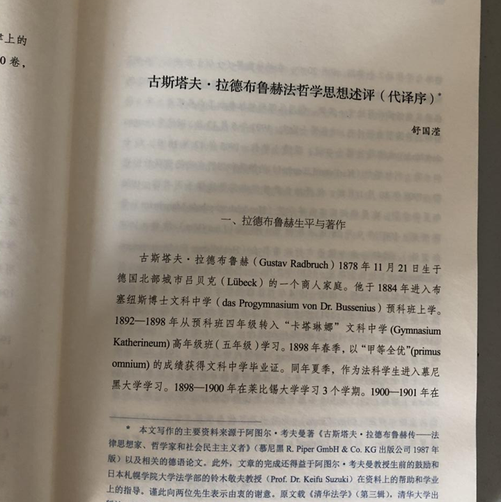 在这本小册子中汇集的警句,并不是拉德布鲁赫像现在这样写出来的。而是由译者从他的全集中摘选出来的。所做的这些,对于这样一位思想铺陈高远宏阔、婉约细腻的作者而言,可能还是远远不够的。拉德布鲁赫的语言既绵密厚重、又简明扼要,既直白清朗、又纯真朴实。他能够采撷到物之精华,宛若把光线集聚为耀眼的亮点。他既是学问人,也是艺术家。当我们阅读或聆听这样的警句时,我们获得了生命的充实和心智的启迪,同时也由于这一表达方式之美而得到一种美的享受。