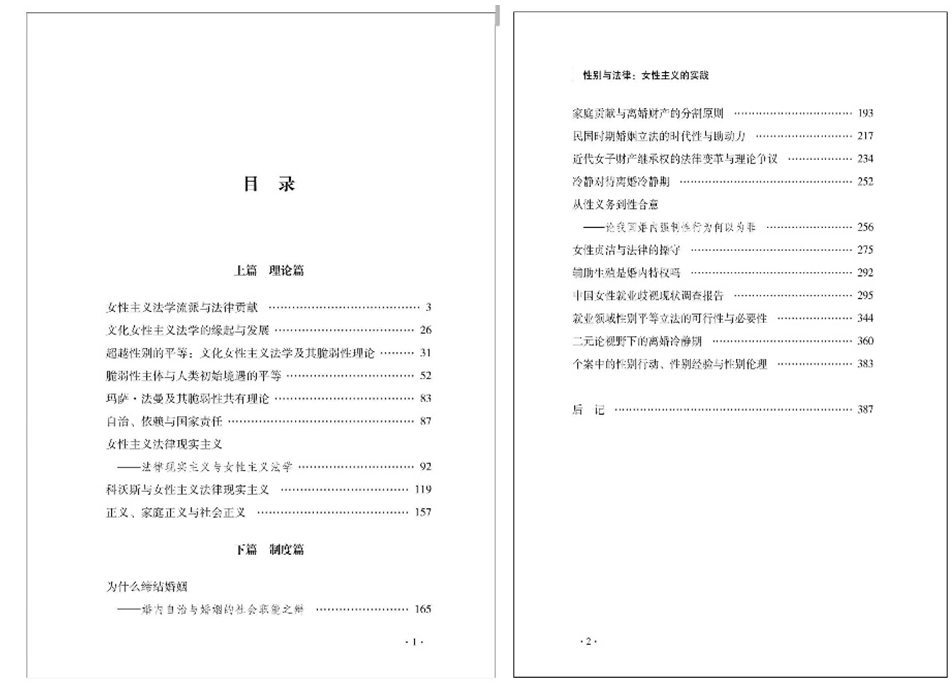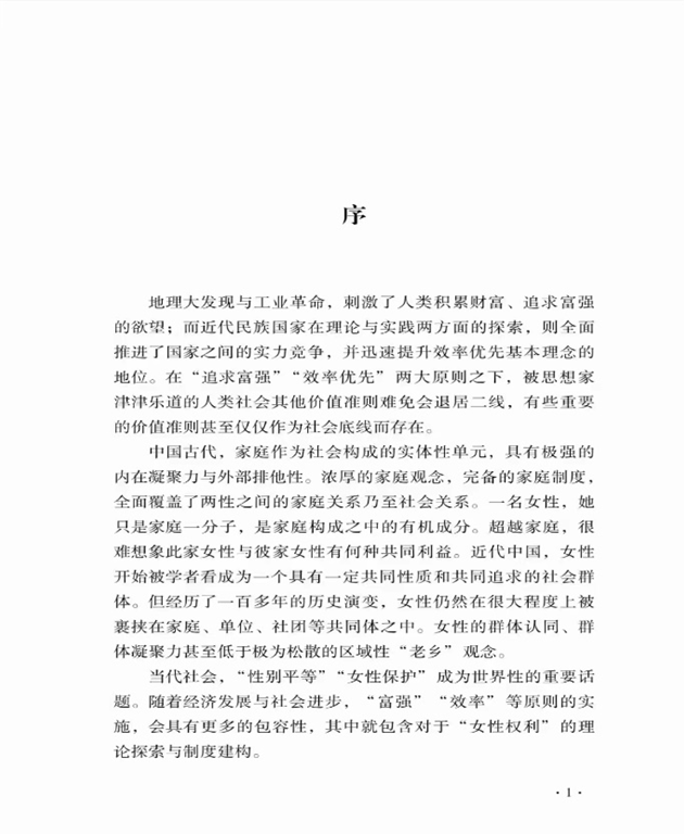 下篇是以作者对性别问题的研究成果为主,有历史观察与发现:把女子财产继承权作为研究近代法律变革的一项重要内容,认为民国时期这一立法上的变化具有划时代的意义,是一种性别权利的突破。但女子财产继承权体现的仅仅是一种权利能力,而不是行为能力;无论是未嫁还是已婚,女性都没有真正的财产支配权,一方面是女性权利依然处在家长权、夫权之下,另一方面女性自身也不具有行为能力,甚至在债务继承时家境贫寒之女反受继承权之害。这场立法突变实则利弊各半,原因在于这项法律变革基于一场政治运动,而不是社会变迁的结果,这一研究对现代法律变革仍然极具启示。也有当下女性的现实境遇与关怀:提出社会性别问题是一个正义问题,家庭内的不公是现代社会不公的一个逻辑起点,家庭内的不平等源于家庭内无酬劳动的不均衡分配。家庭内的正义不仅关系到女性自身发展,也关乎儿童的成长及社会正义的培育。正义的家庭才是构成正义社会的根基,而能够帮助培育正义的个体和公民的家庭必须是符合正义标准的家庭;其它内容还包括女性就业歧视问题、女性的生育价值、女性在婚姻家庭中的法律处境等等各种现实性问题。
