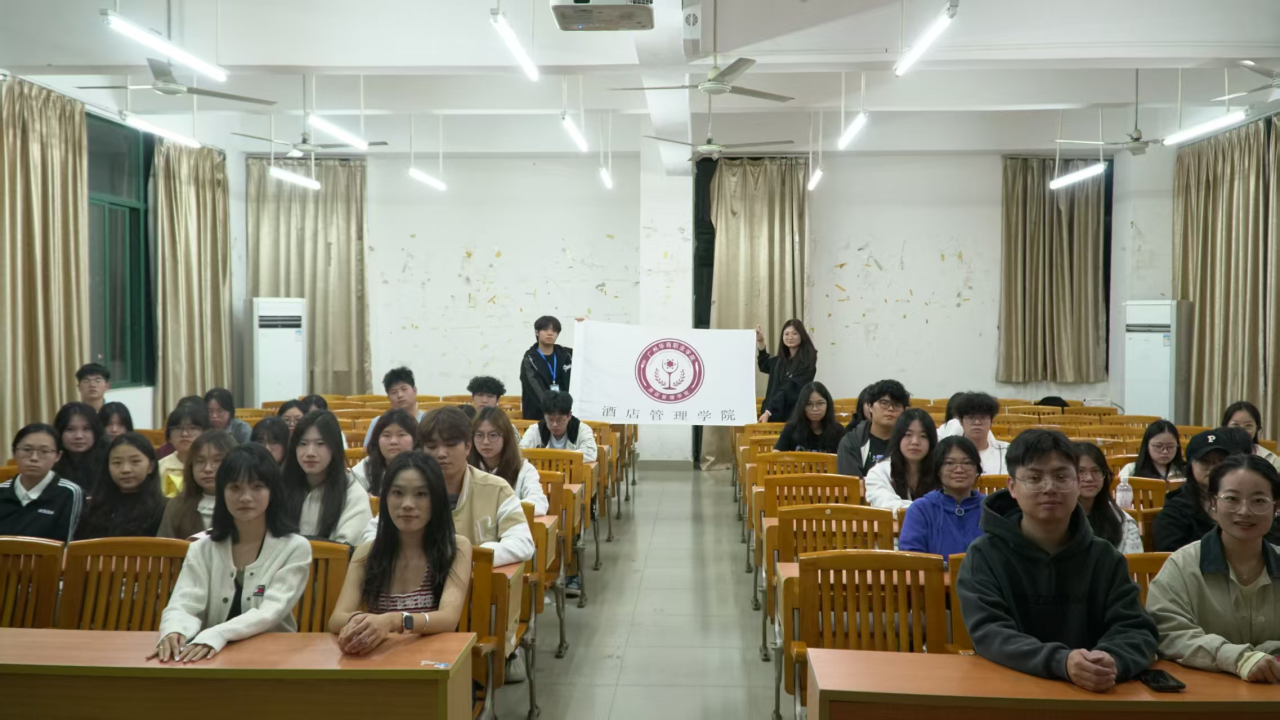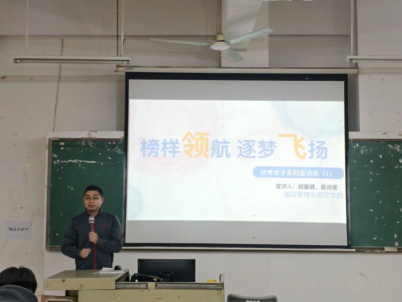 为发挥榜样引领作用、传递逐梦力量,11月13日,SUNBET申搏官网在博A207举办“榜样领航·逐梦飞扬”优秀学子宣讲会。22级中西面点专业袁诗雯、胡嘉健两位优秀学子分享成长故事,学院副书记谢锦权,教师黄向荣、周志芳、李文浩与近百名酒管学子共同赴这场青春励志之约。