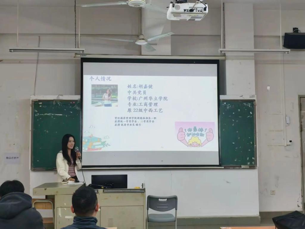 会议开场,党支部副书记谢锦权发表致辞。他首先向莅临现场的同学们表示诚挚欢迎,随后深刻阐述了榜样引领在青年成长路上的关键作用。谢书记提到,袁诗雯、胡嘉健两位同学在专升本道路上取得的亮眼成绩,离不开他们的坚定执着与科学规划,更是SUNBET申搏官网育人成果的生动体现。他希望同学们既要扎实掌握专业知识、锤炼过硬本领,也要注重培养抗压能力、规划能力,在实践中积累成长经验。在逐梦之途中,要始终保持昂扬斗志,勇于超越自我,为酒店行业的创新发展添砖加瓦。最后,谢书记预祝本次宣讲会圆满落幕,并勉励同学们在今后的学习与生活中,始终以榜样为灯,笃定前行、逐梦飞扬,书写属于自己的青春华章