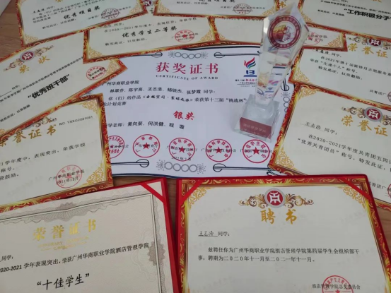 在校期间王志浩同学曾担任学院组织部部长以及班级班长,在工作和学习中王志浩同学受到了老师和同学们的肯定,获得了“优秀班干部”、“工作积极分子”等奖项,王志浩同学还参加各种专业比赛来丰富自己的专业知识,比如广东省导游职业技能比赛获省级三等奖,广东省挑战杯创新创业大赛获省级银奖,王志浩同学希望通过自己的努力消除其专业因疫情影响所带来的各种阻碍,从而开辟一条新的道路。
