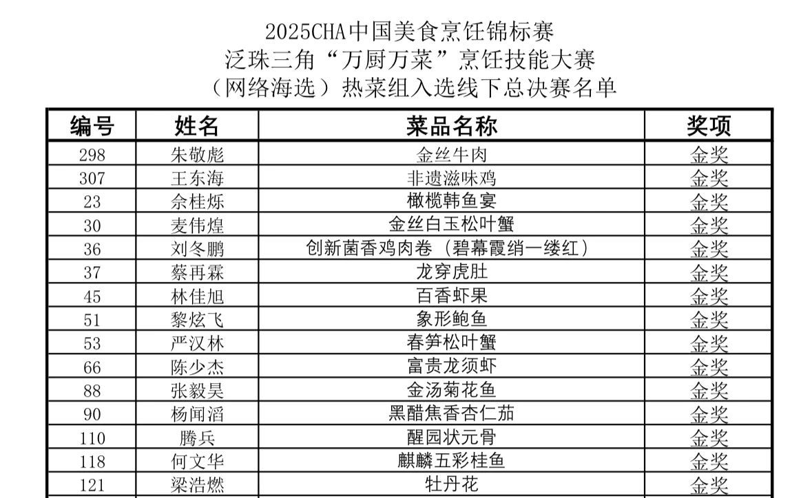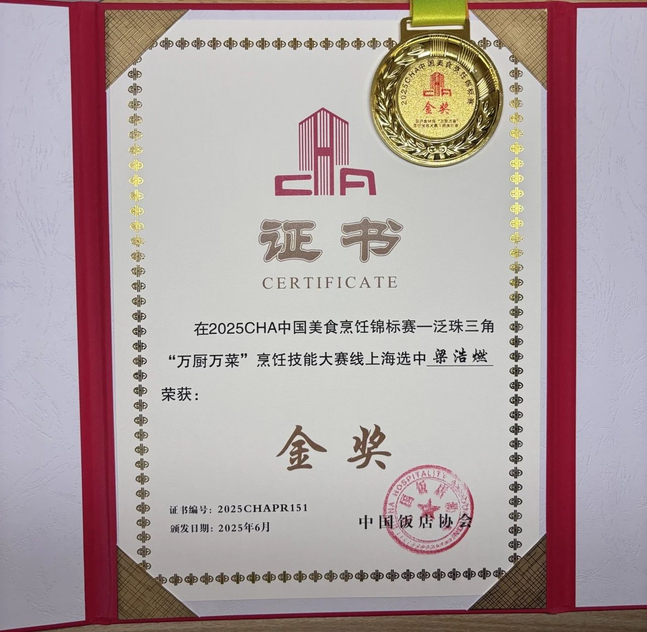喜报!梁浩燃获2025CHA烹饪赛网络海选金奖!