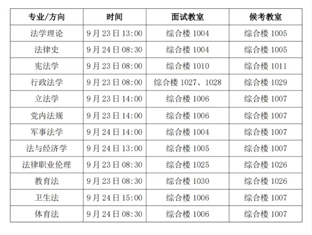 2.军事法、法与经济学、法律职业伦理、教育法、体育法、卫生法:综合楼1026。