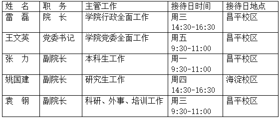 根据《新葡萄官网amg院领导接待日制度》的规定,结合学院实际,现开放本学期教学周新葡萄官网amg院领导接待日,具体安排如下: