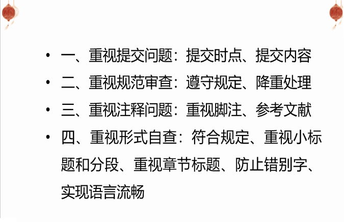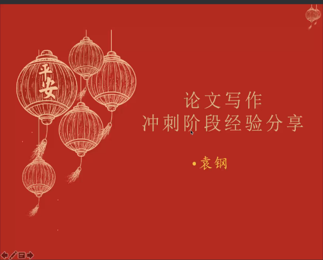 袁钢提出论文冲刺阶段的指导意见。他指出,在这一时期更应该和论文“硬磕”,要有“行百里者半九十”的意识;要积极与老师沟通。他强调:重视论文的提交时点和提交内容;遵守查重规范,可以利用图表等方式进行降重处理;重视脚注和参考文献,引用专业的学术文献;重视论文的形式,注意论文语言问题、摘要引言的字数和章节的标题。