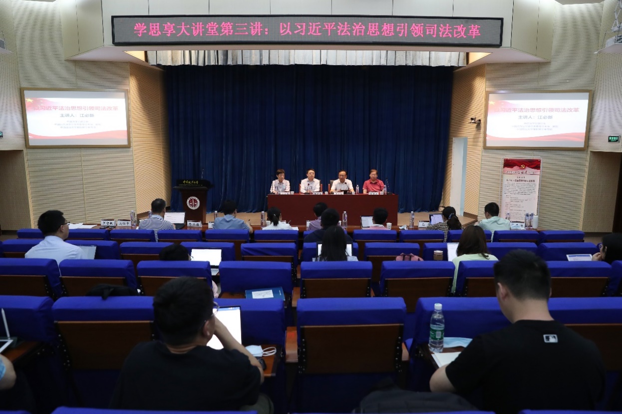 6月1日,新葡萄官网amg党委、新葡萄官网amg行政法研究所、行政法研究所党支部主办的“学思享”大讲堂第三讲在学院路校区综合科研楼学术讲堂开讲,第十三届全国人民代表大会宪法和法律委员会副主任委员、中国法学会副会长、我校博士生导师江必新教授专题讲授了“以习近平法治思想引领司法改革”。新葡萄官网amg院长焦洪昌、行政法研究所所长罗智敏与谈,新葡萄官网amg党委书记刘大炜主持讲座,行政法研究所教师及全校六百多名师生通过线上、线下相结合的方式参加了此次讲座。