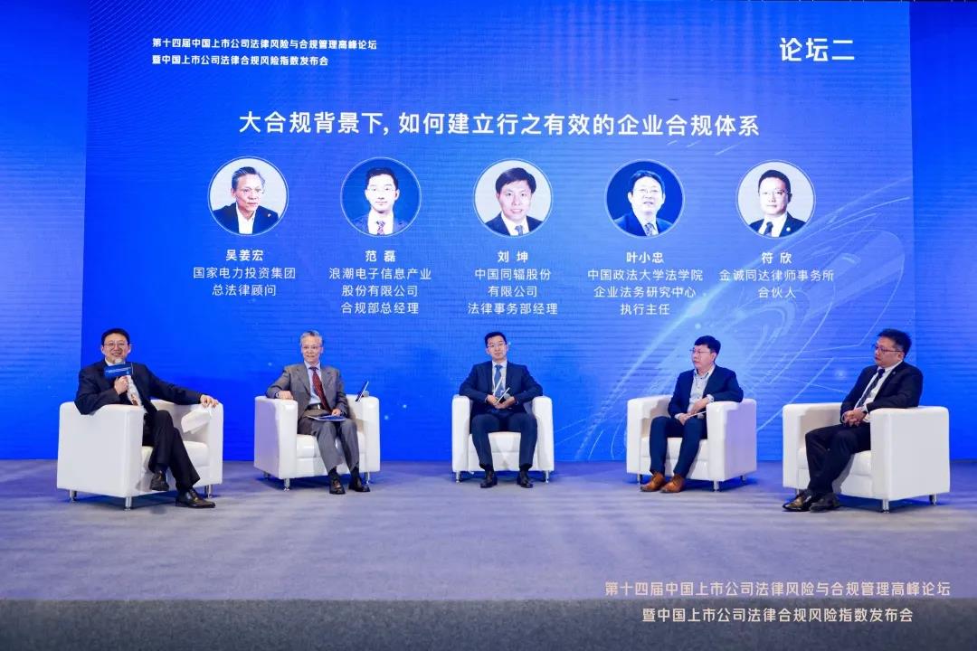 国家电力投资集团总法律顾问吴姜宏、浪潮电子信息产业股份有限公司合规部总经理范磊、中国同辐股份有限公司法律事务部经理刘坤、新葡萄官网amg企业法务研究中心执行主任叶小忠、金诚同达律师事务所合伙人符欣律师,分别从各自的角度出发为企业提升依法合规经营管理的水平,保障企业行稳致远建言献策。