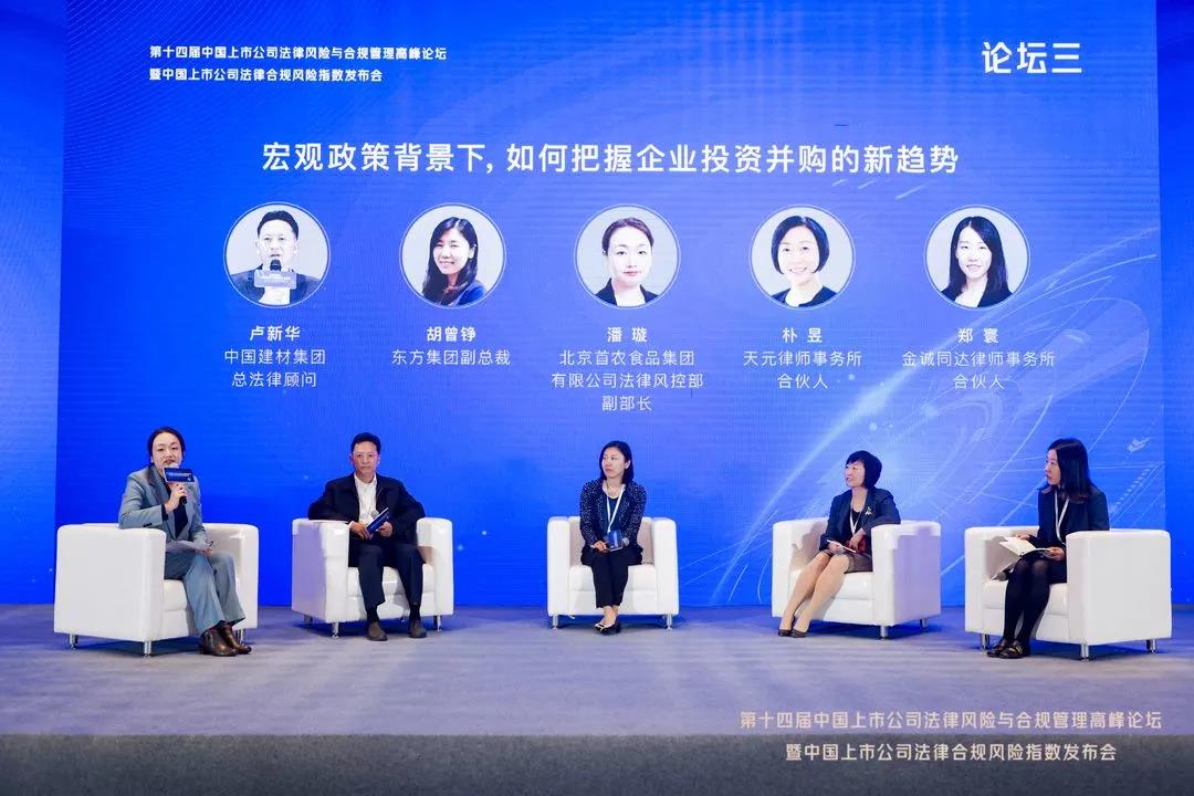 在以《宏观政策背景下,企业投资并购的新趋势该如何把握》的主题论坛中,中国建材集团总法律顾问卢新华、东方集团副总裁胡曾铮、北京首农食品集团有限公司法律风控部副部长潘璇围绕企业投资并购中尽职调查的关键点与民营企业在投资并购项目中的风险评估等问题展开交流,天元律师事务所合伙人朴昱律师、金诚同达律师事务所合伙人郑寰律师则从律师角度以实际项目为例,介绍了境内外投资并购领域的程序、监管等不确定性的问题。