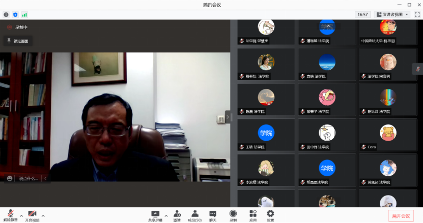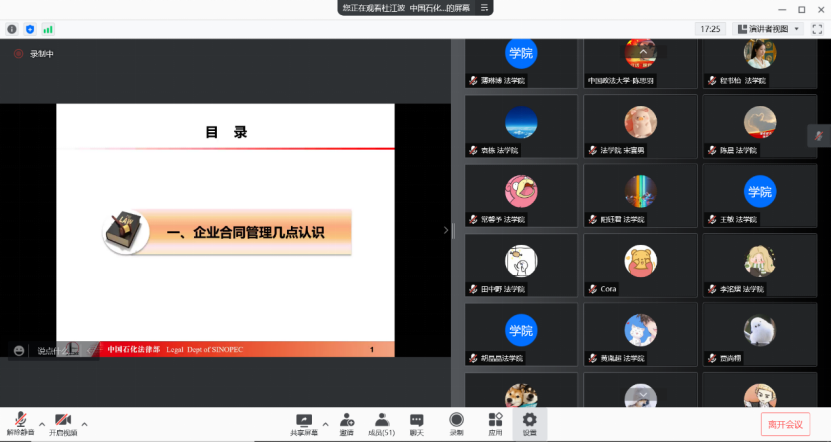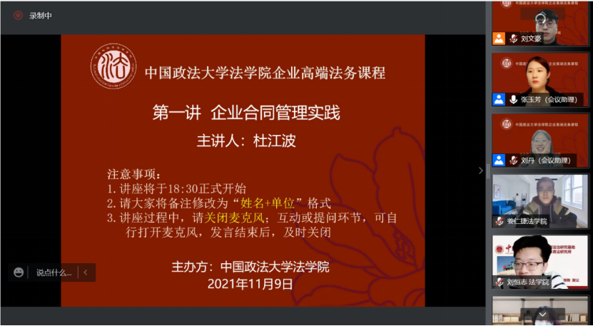 (法研通讯社 图/文 荆洁)为贯彻落实习近平总书记考察新葡萄官网amg时重要讲话精神、《教育部中央政法委关于坚持德法兼修 实施卓越法治人才教育培养计划2.0的意见》及《新葡萄官网amg建设高水平研究生教育行动方案》,提升研究生培养质量,2021年11月9日,新葡萄官网amg实务讲堂之企业高端法务课程第一讲“企业合同管理实践”在腾讯会议上举办,由中国石化集团公司企改和法律部负责人杜江波主讲。