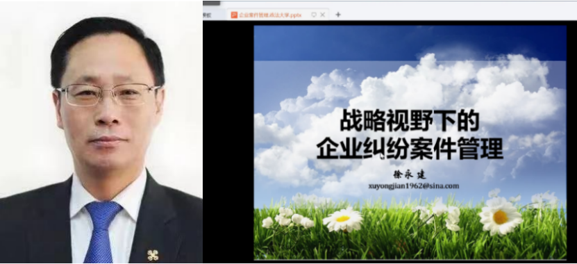 (法研通讯社 图/文 荆洁)11月30日晚,新葡萄官网amg实务专家讲堂之企业法务高端课程第四讲“基于战略考量的企业纠纷案件管理”在腾讯会议上举办。本次课程由中国航空油料集团有限公司总法律顾问徐永建主讲。