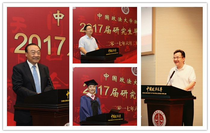 导师代表何兵在致辞中通过讲述亲身经历和见闻,告诫同学们要“风物长宜放眼量”,失意时要耐得住寂寞,保持赤子之心;得意时要戒骄戒躁,免受蒙蔽。他叮嘱同学们要认清自己的社会和国家责任,牢记自己来自于人民,牢记入学时“挥法律之利剑,持正义之天平。除人间之邪恶,守政法之圣洁”的誓言。研究生院副院长袁钢作为导师发表发言,他希望全体毕业生能“播下幸福的种子”,即法治、健康、责任、勤奋、毅力。未来法治的重担将落在各位学子身上,同学们要做一个胸怀天下、心存正义的法大人。毕业生代表花乔木代表新葡萄官网amg2017届全体毕业生进行主题为“新葡萄官网amg—英雄”的发言,感谢新葡萄官网amg的培养、传达学生对新葡萄官网amg的情谊。他表示在以后的道路中,毕业生会秉持母校“厚德明法,格物致公”的精神,今日的暂别是为来日更好的重逢。