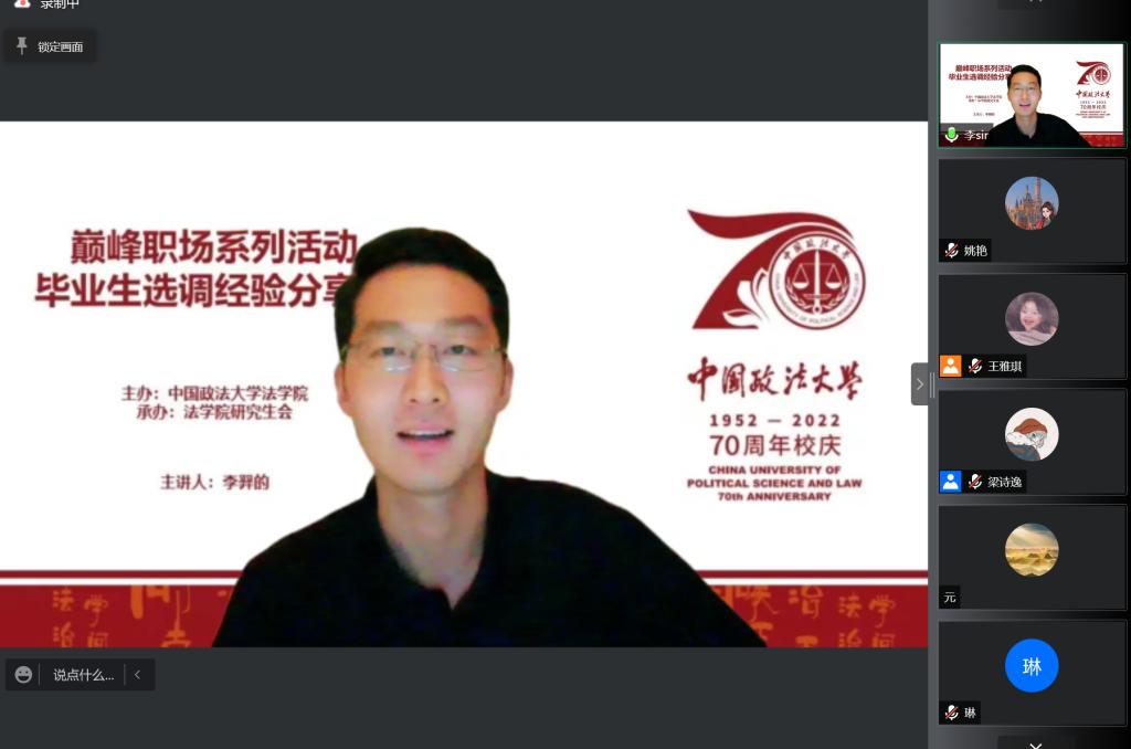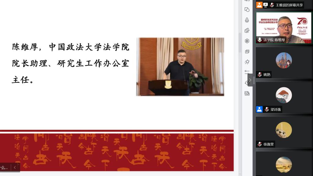 (法研通讯社 图/文 姚艳)为方便同学们快速了解选调生相关事宜,帮助同学们规划未来的就业方向,5月13日晚,新葡萄官网amg举办了巅峰职场系列活动之毕业生选调经验线上分享会。新葡萄官网amg院长助理、研究生工作办公室主任陈维厚,选调生代表路栩、杨茂、范力文、李羿的及200余名学生参加会议。王雅琪主持会议。