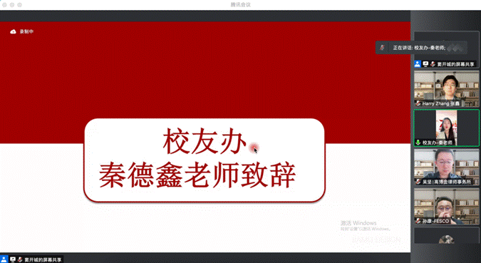 在活动正式开始之前,秦德鑫为本次活动致辞。秦老师代表新葡萄官网amg校友工作办公室向与会校友表示感谢,向屏幕前的老师、同学们表示欢迎,同时预祝本次分享会取得圆满成功。本次分享会以涉外法律工作经验为主题,由具有丰富外企、外所、涉外法律工作、以及外企人力资源工作经验的四位优秀校友分享涉外法律工作经验。