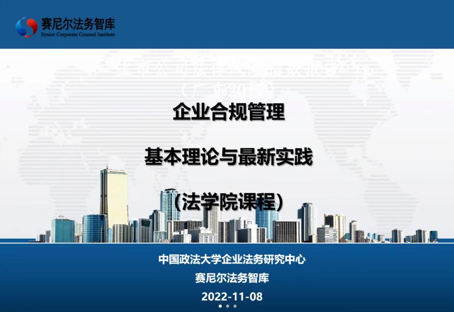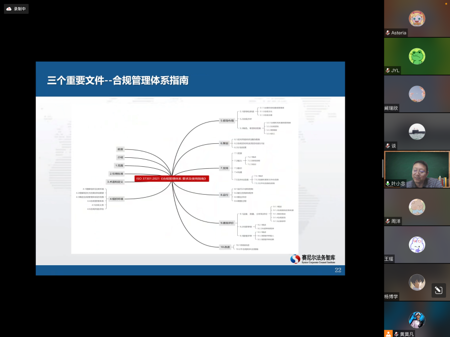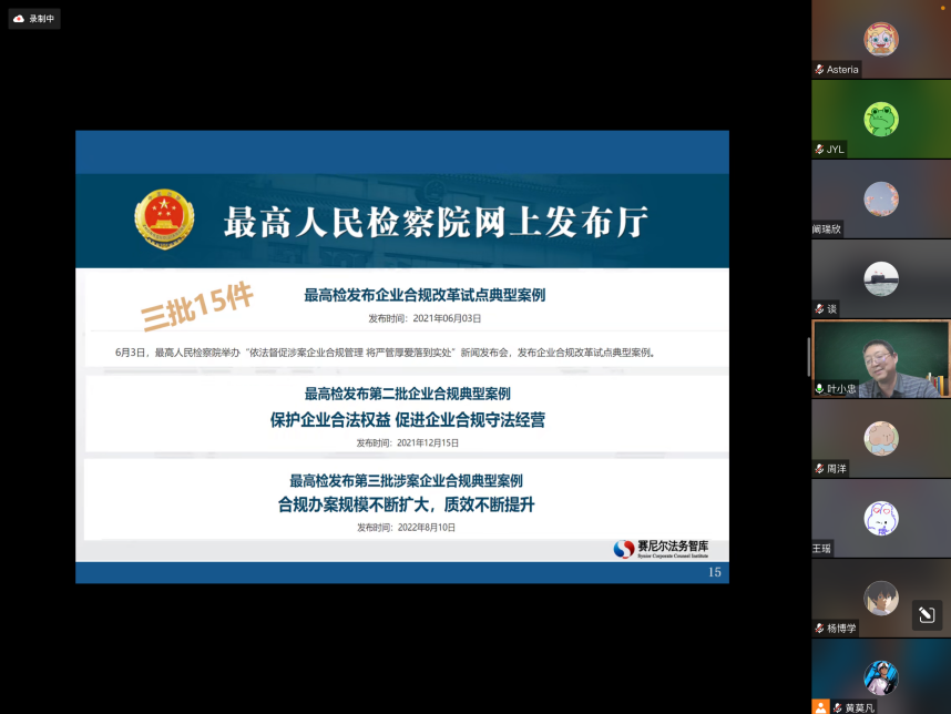 (法研通讯社 图文/王思洋) 为有效提升研究生培养质量和水平,引导同学们合理规划学术生涯和职业发展道路,2022年11月8日晚,由新葡萄官网amg主办、新葡萄官网amg研究生会承办的“新葡萄官网amg实务专家讲堂之企业法务高端课程”在腾讯会议平台开展第二期课程,将中国企业在整个法务管理领域的最核心、最前沿的做法引入课堂,实现优质资源共享、协同育人,为同学们未来的职业选择和发展道路提供了直接且强有力的帮助和支持。本次讲堂很荣幸地邀请到赛尼尔法务智库总裁叶小忠就“企业合规管理基本理论与最新实践”主题开讲,本次讲堂由黄莫凡同学主持。