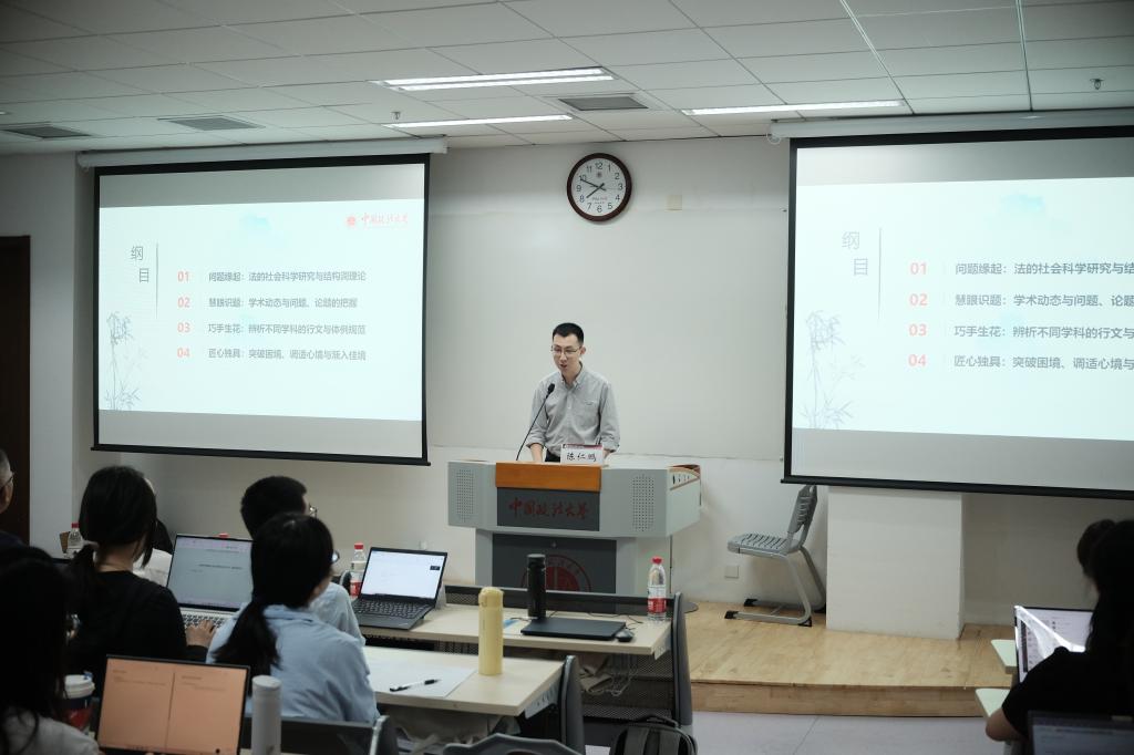 陈仁鹏围绕“社科法学视域下的法史研究与论文写作”为主题进行分享。首先,他以何为“社科法学”作为引入,将社科法学研究的视野、理路与方法进行大致的勾勒,希望同学们以问题为导向,尝试多样化的研究进路。其次,他建议同学们积极研读经典、与经典对话;以国家社会科学基金、中国法学会的课题为导向把握学术动态,从而进行论题选取,为后续写作奠定良好的基础。最后,他希望大家多读书、多沉淀,以平和的心态去面对研究生的生活与学术论文写作。