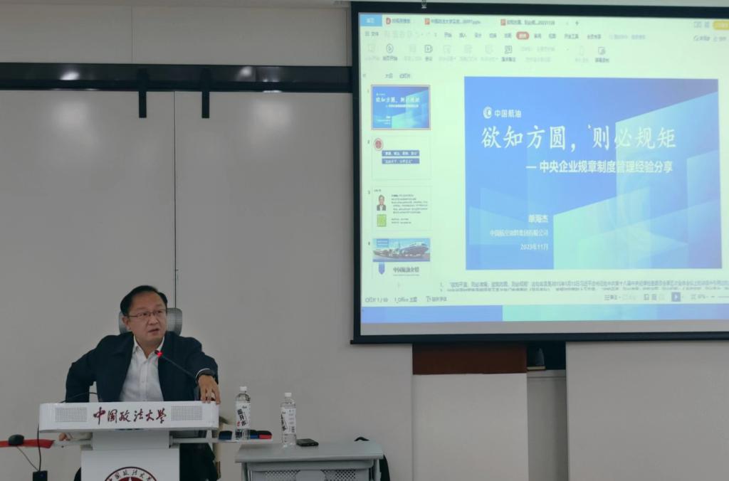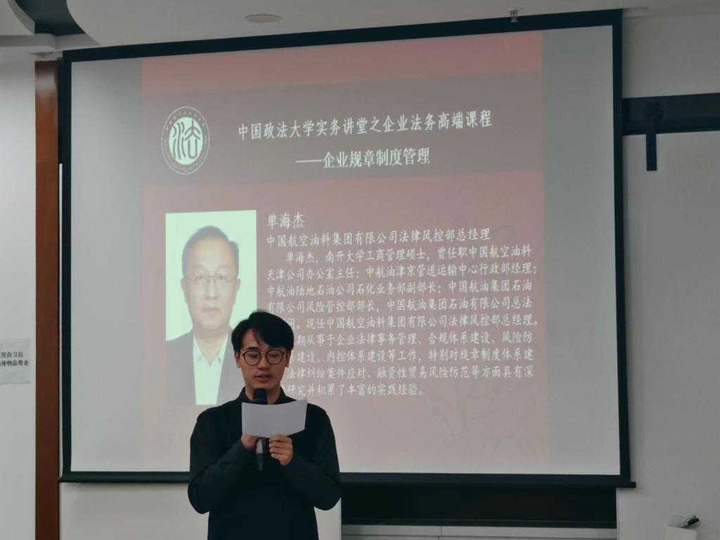 (法研通讯社 图/徐毛毛 文/郑斯锴)为提升卓越法治人才培养质量,实现优质教育资源共享、协同育人,2023年11月28日,新葡萄官网amg实务专家讲堂之企业法务高端课程第五讲之“企业规章制度管理”在我校学院路校区举办。本次课程由南开大学工商管理硕士、现任中国航空油料集团有限公司法律风控部总经理单海杰主讲,由陈哲同学主持。