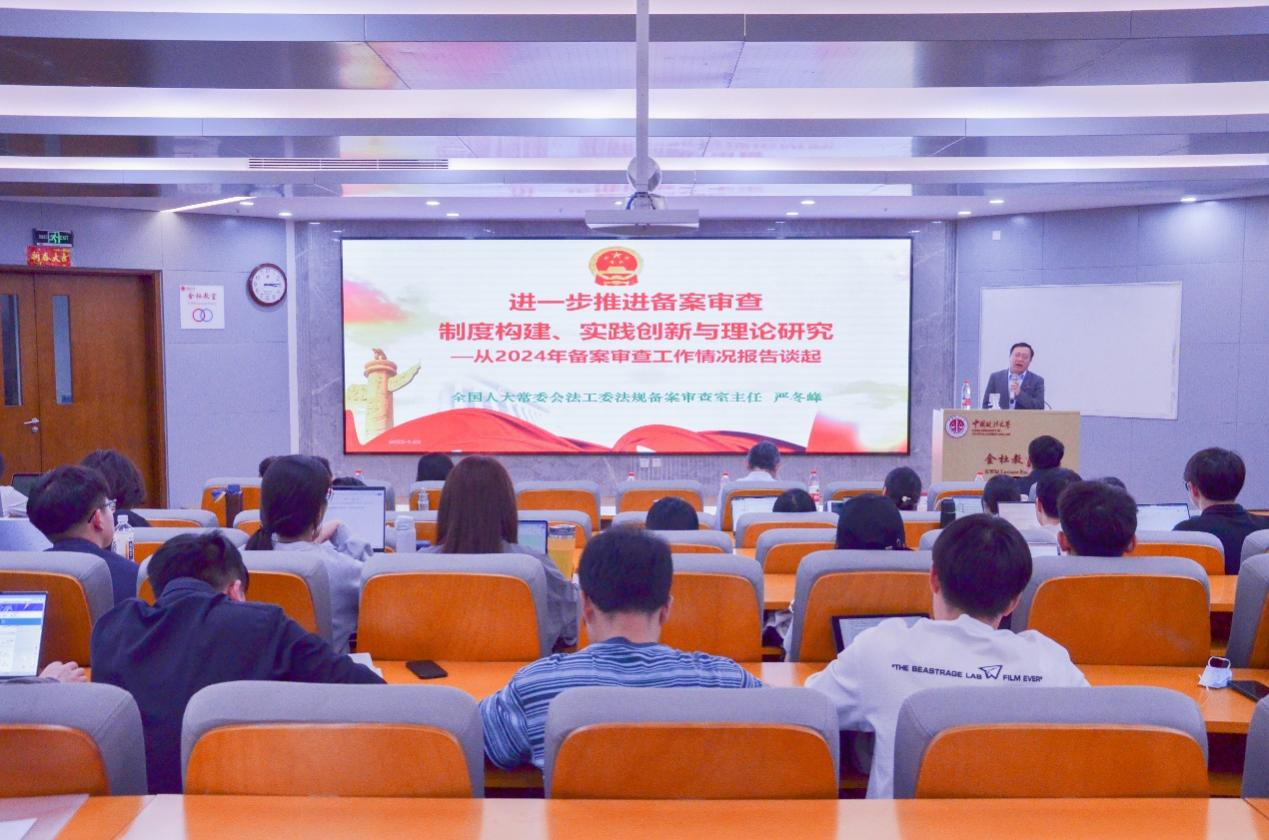严冬峰主任首先回顾了备案审查在我国发展的制度历史;其次着重讨论了近年来全国人大法工委的备案审查工作情况报告,尤其对师生们比较感兴趣的工作内容和制度建设进行讲解;最后对审查纠正的存在合宪性合法性问题的典型案例作了详细阐释。