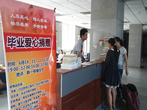 在捐赠活动期间,来自不同院系、不同专业的毕业生将自己所捐赠的物品送到指定地点。他们小心放下自己的物品,认真写下自己的名字,一举一动,一言一语无不体现出他们对母校的不舍、对活动的支持和对新生们的期待。整个活动场面温馨而又感人。