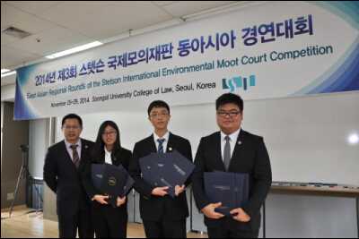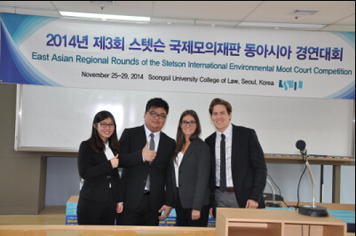 2014年11月25日至11月29日,第19届国际环境法模拟法庭大赛东亚赛区选拔赛在韩国崇实大学(Soongsil University)举行。经过四天激烈紧张的比赛,我校代表队最终获得东亚赛区冠军以及东亚赛区最佳诉状(Best Memo)的荣誉,成功晋级国际决赛。谢玉麟同学获得最佳辩手(Best oralist)奖项。